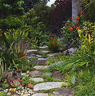 Using concrete, curving lines and dramatic color combinations, Hand created an emotionally evocative space that houses an extraordinary plant collection.